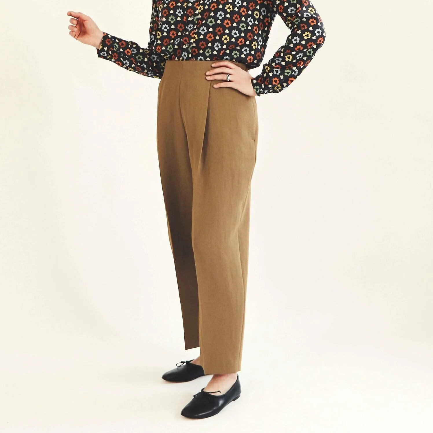 High-waisted, peg-top trousers could be a nice option as you can also regulate their size with a belt.