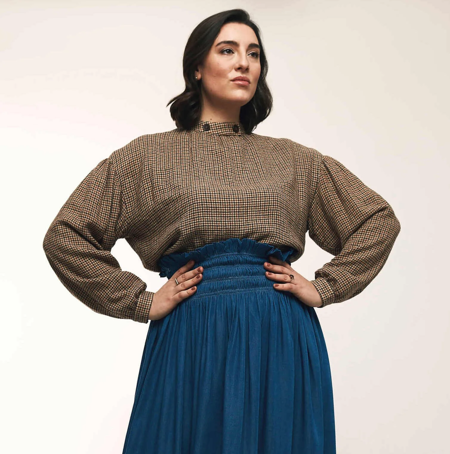 When it comes to tops, your best option is to find one that has a straight cut with a medium heavy fabric like silk, tencel, cotton, wool or velvet. These kind of tops drape nicely around your torso. Nothing is exposed and so when you gain or lose some weight it won’t be so obvious that it’s a little too big. (Brand: Tinsels)