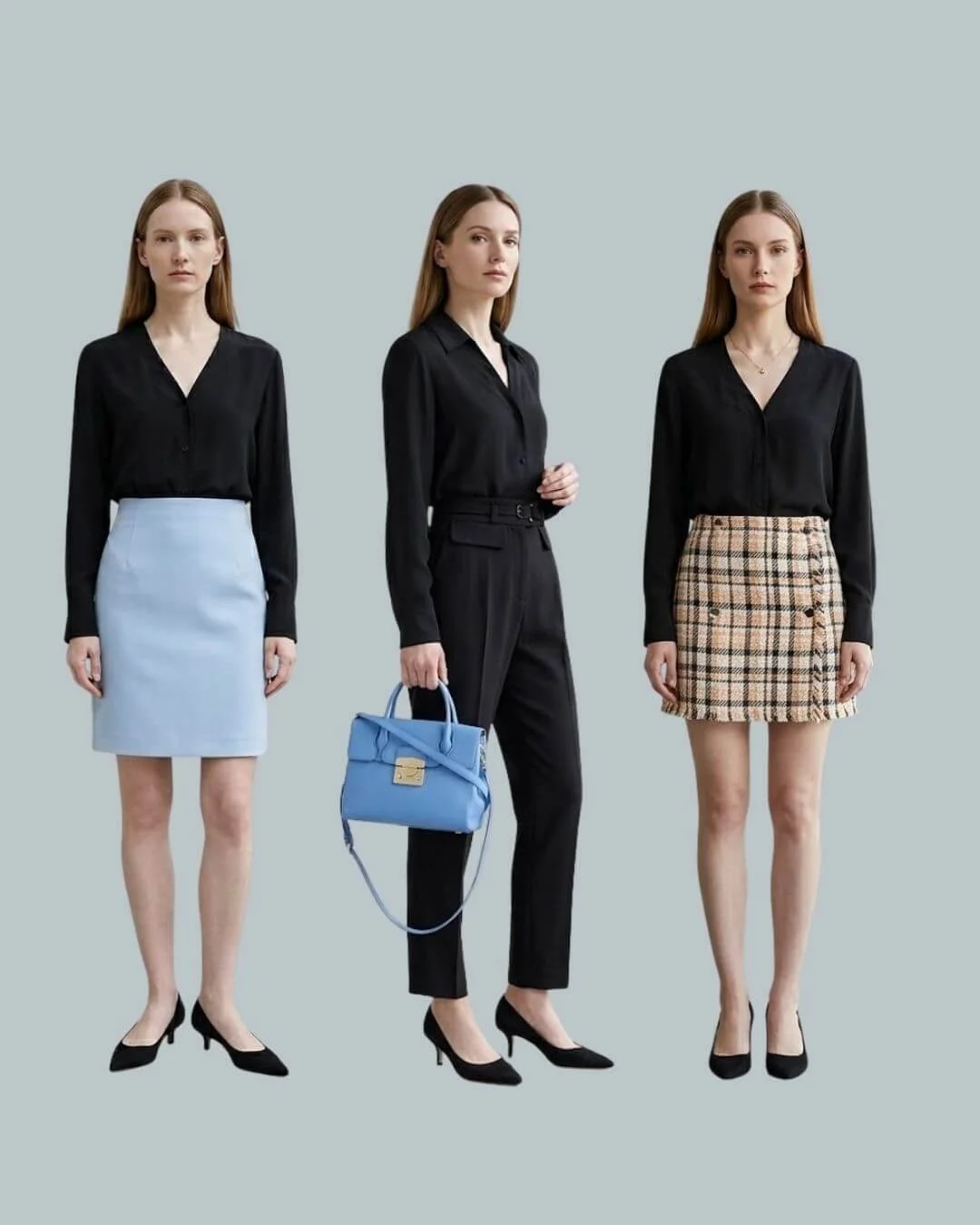 When these 10 pieces mix together, they create 14 fully interchangeable outfits. Every combination works because each piece was selected using the same proportions logic: colour compatibility, waistline placement, and length ratios calculated for frames under 160 cm.